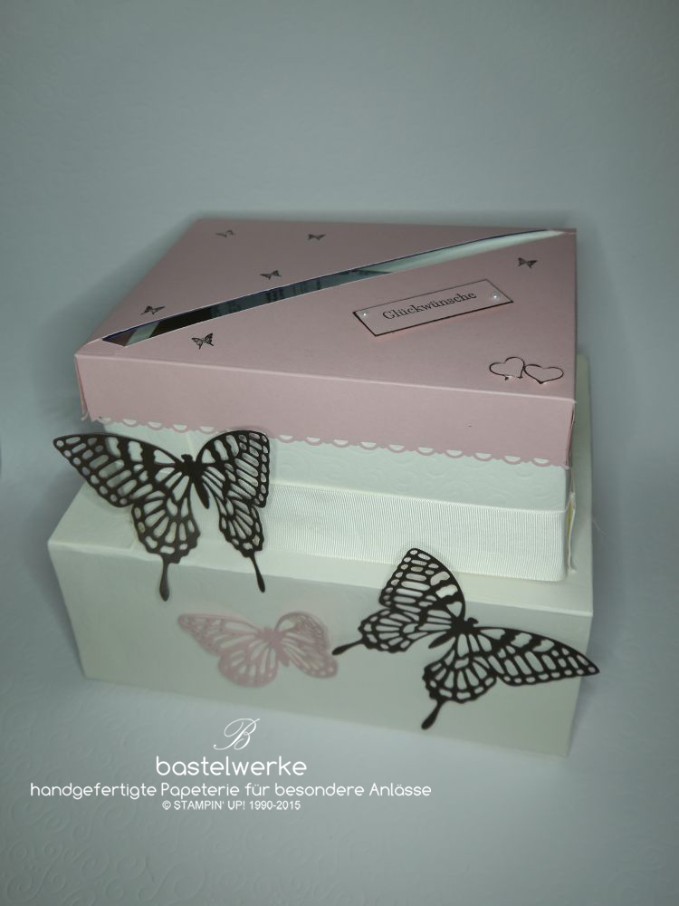 Überraschung aus der Torte. Eine Arbeitskollegin war auf der Suche nach einer Verpackung für ein Geldgeschenk für eine Hochzeit und bat mich um Hilfe. Ein einfacher Umschlag war ihr zu fad und unpersönlich. Ich erklärte ihr das Prinzip einer Explosionsbox und zeigte ihr ältere Auftragsbeispiele und traf damit genau ins Schwarze. Kombiniert wurden hier die Farben Saharasand, Vanille Pur und Safrangelb.