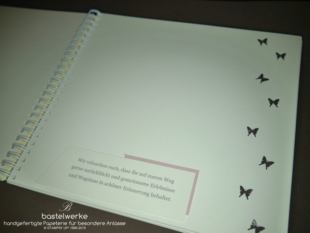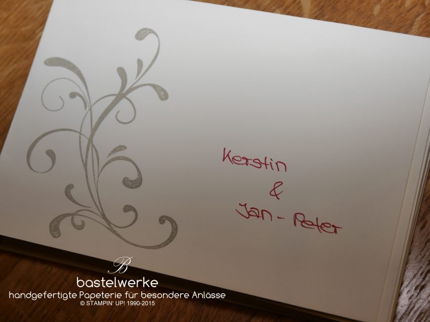 Platz für Erinnerungen gab es in einem, dem Motto der Hochzeit entsprechenden, Gästebuch. Dessen Innenseiten waren individuell gestaltet: