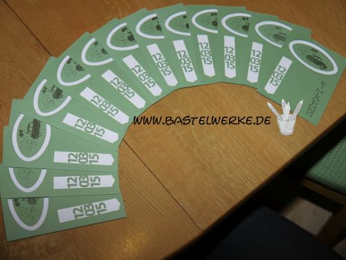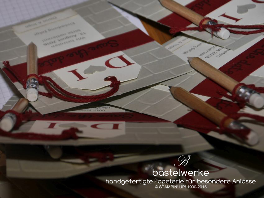 Um der Aufforderung, sich den Termin zu notieren, auch nachkommen zu können, wurde an jeder Karte ein Mini-Bleistift befestigt.