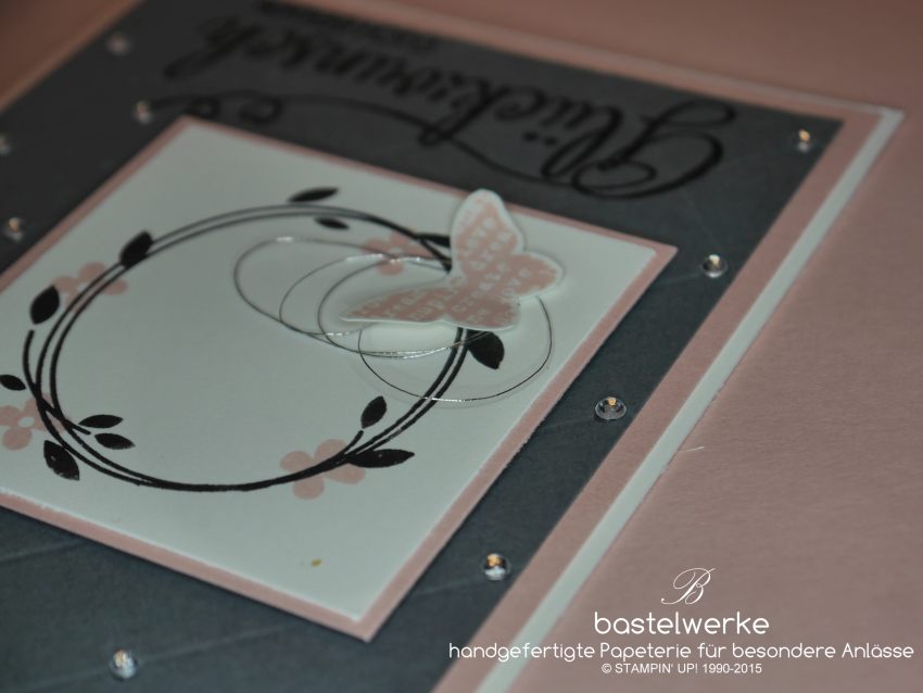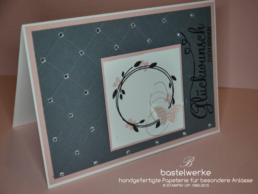 Eine Karte in den Tönen rosa& & grau würde gut zum Hochzeitspaar passen. Und aus diesem Wunsch entstand dann diese wundervolle Karte mit vielen, vielen Glitzersteinchen..