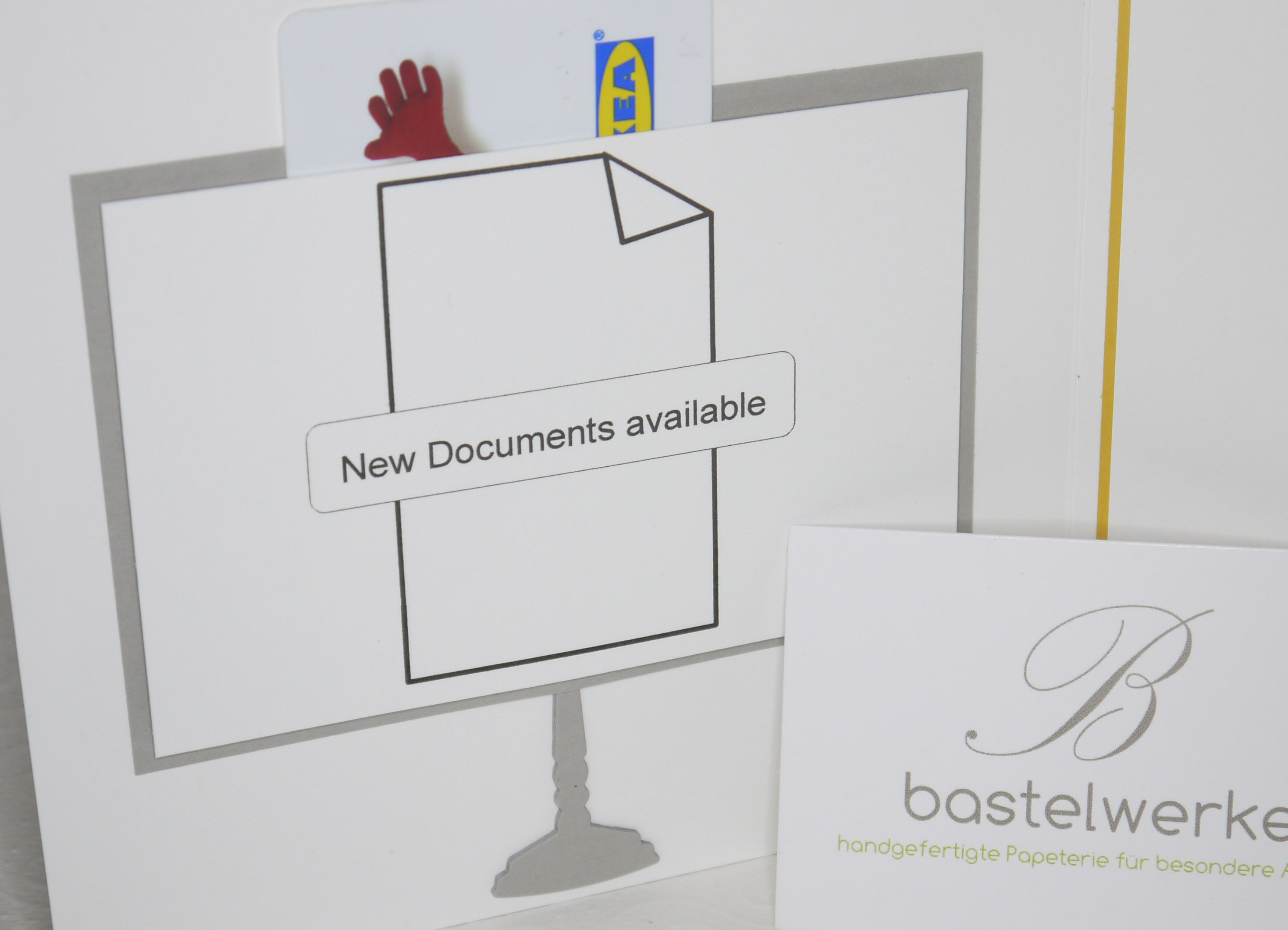 Integriert werden sollten die Logos der alten und neuen Bank sowie im Inneren ein PC auf dem steht „New Documents available“. Dahinter habe ich ein Fach eingebaut, um den Gutschein zum Jubiläum verstauen zu können.