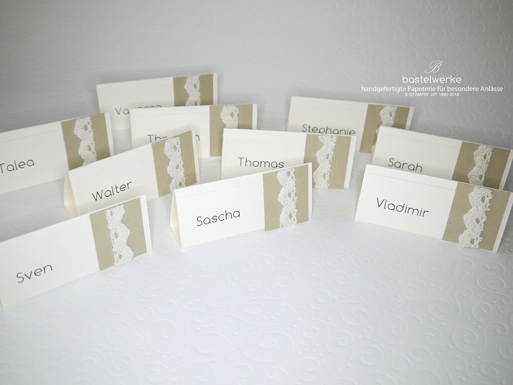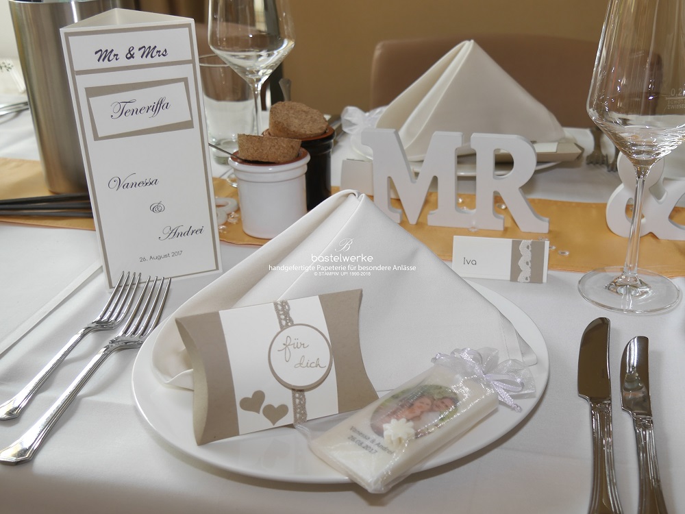 Die Menükarten (links) wurden im beliebten Dreiecksformat gestaltet und die Gewürz-Gastgeschenke fanden in dieser schönen Box einen passenden Platz (siehe Teller). Außerdem erhielt jeder Gast ein persönliches Platzkärtchen mit seinem Namen.