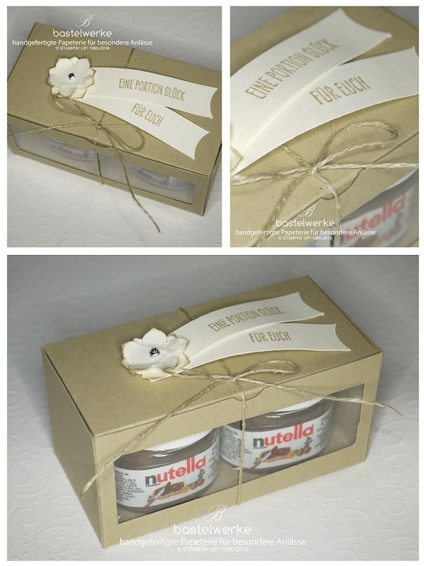 Wie das geht? Ganz einfach: Die Kundin wollte die Nussnougat-Creme gern für ein Paar verschenken. Für viele gilt sie als ein kleines Stück vom Glück, weshalb der Stempel wie gerufen kam. Die Idee war schnell ausgereift, die Farben gewählt und eine Portion Glück für zwei ist es geworden.