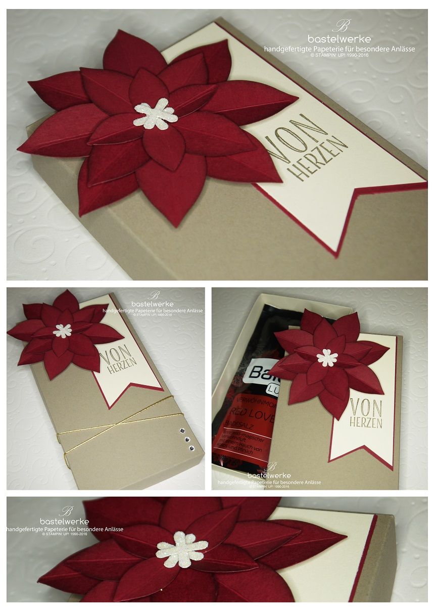 Dazu durfte ich diese zwei weihnachtlichen Verpackungen gestalten. Im Fokus ist der wunderschöne Weihnachtsstern, der mit Hilfe der Handstanze festliche Blüte entstanden ist. Schenken ist Herzenssache wird hier wieder groß geschrieben, denn Kleinigkeiten sind genau mein Ding.