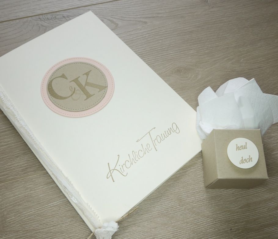 Kirchenheft und Taschentücher "Für Freudentränen" auf Wunsch mit dem Aufkleber "heul doch"