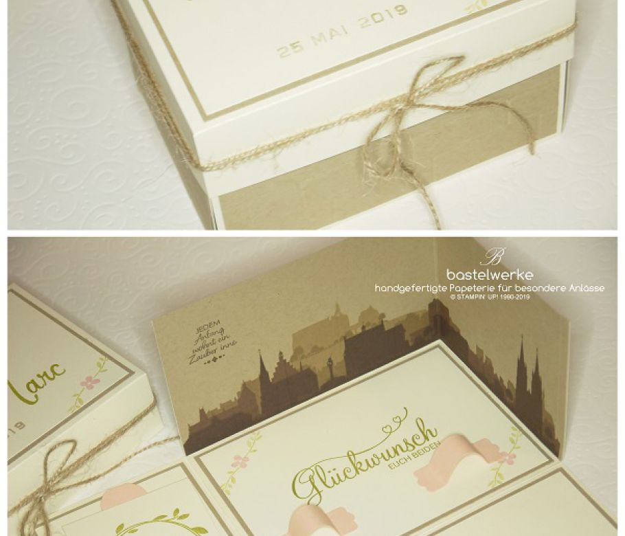 Für eine Arbeitskollegin meines Mannes durfte ich diese Box herstellen. Ihr Neffe Marc heiratete im Mai seine Traumfrau Agathe und sie sollten mit einem persönlichen Geldge...