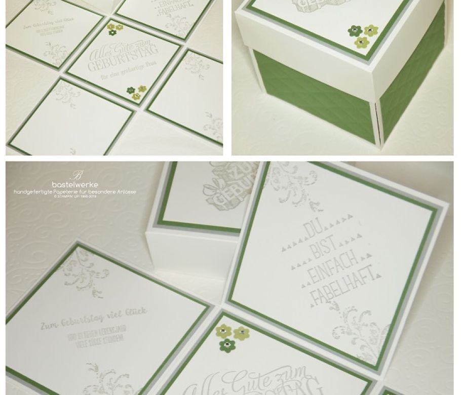 Diese Geburtstagsbox bekommt heute eine geliebte Ehefrau in den Wunschfarben weiß, grau und dunkelgrün. Neben vorgefertigten Sprüchen bleibt auch hier noch Platz für die pe...