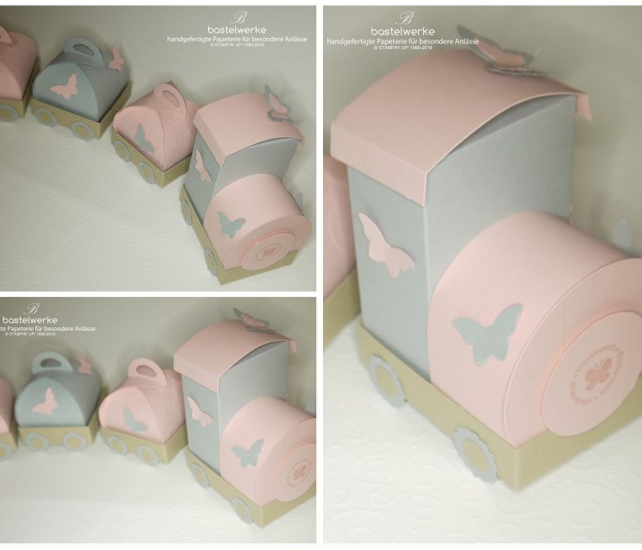 Dieser Babyzug wurde zur Geburt eines Mädchens bestellt. Eine Auftragsarbeit in den Wunschfarben Rosa und Grau. Der Wunsch kam auf, dass die Waggons mit vielen Schmetterli...