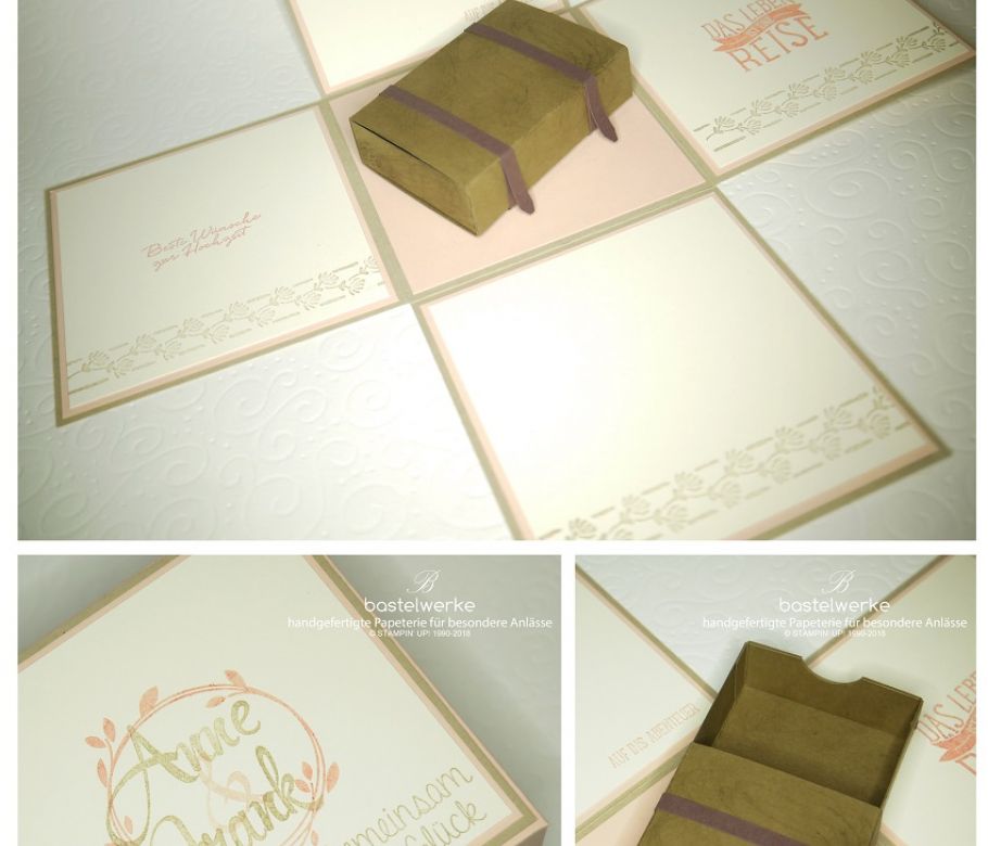 Hochzeitsgeschenke zum Motto Reisen. Der schöne Spruch "Das Leben ist eine Reise" bietet sich hervorragend an. Zusammen mit einem Koffer voll Geld und der gemeinsamen Rei...