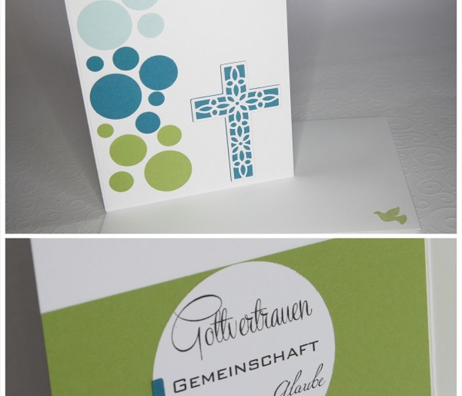 Die Begriffe "Gottvertrauen, Gemeinschaft, Segen, Glaube, Bekenntnis" habe ich von der Einladungskarte aufgegriffen und für die Auftraggeberin in einer jugendlich und farb...