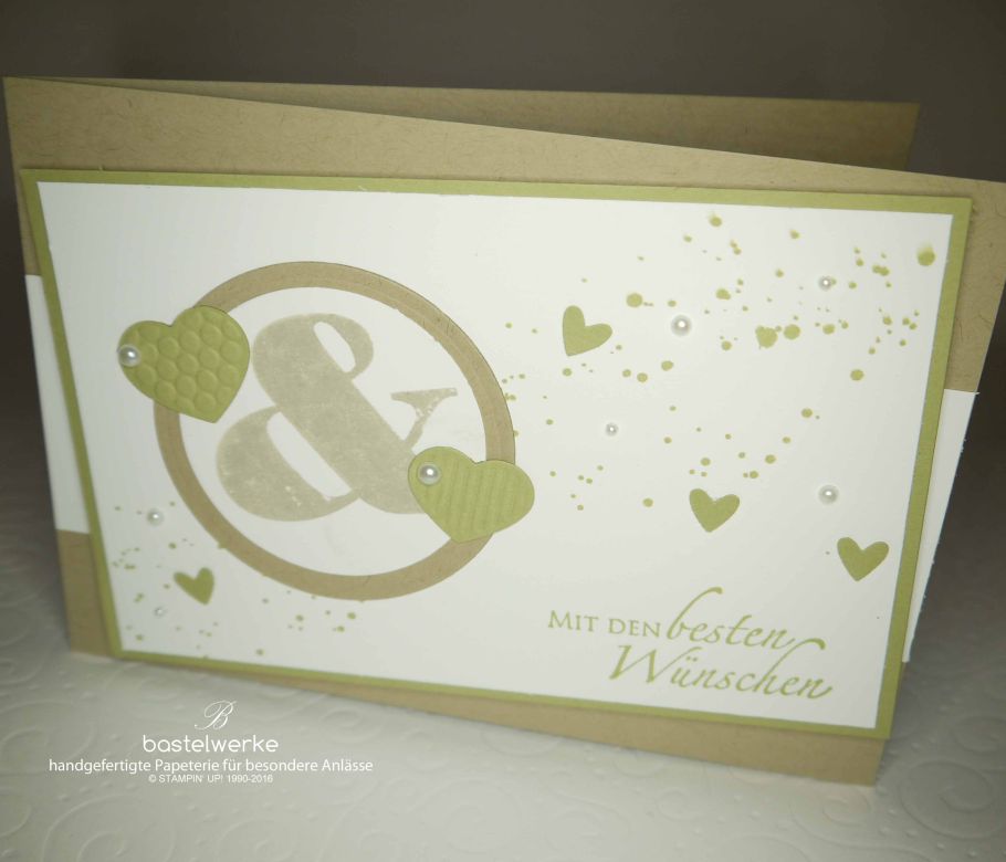 Mit den besten Wünschen macht sich diese Karte zur Hochzeit auf die Reise. Die Kombination von Farngrün, Saharasand und Savanne wirkt edel und frisch zugleich.