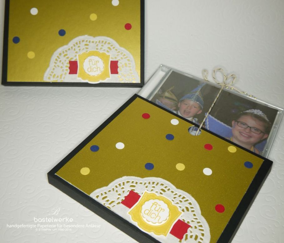 Letzte Woche durfte ich eine CD-Verpackung für unser Kinderprinzenpaar erstellen. Natürlich in den Vereinsfarben schwarz / gold und mit ein bisschen närrischem Konfetti.