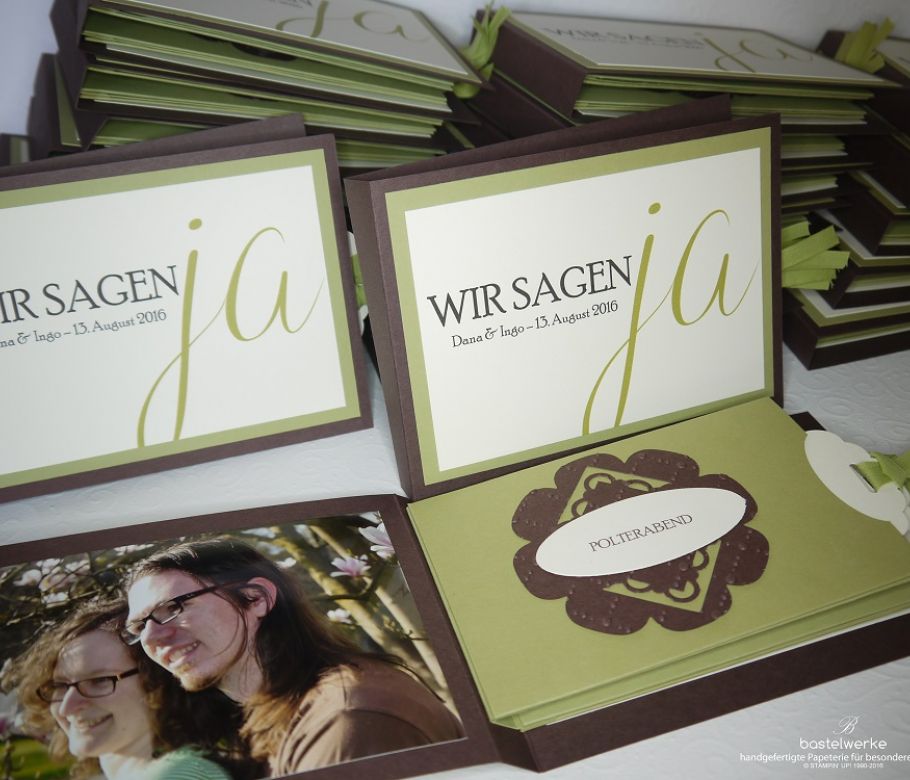 Diese Einladung besteht aus drei Teilen, die mit einer Niete zusammengehalten werden. Nach dem Deckblatt folgt ein Bild des Brautpaares und schließlich der Text zur Einladu...