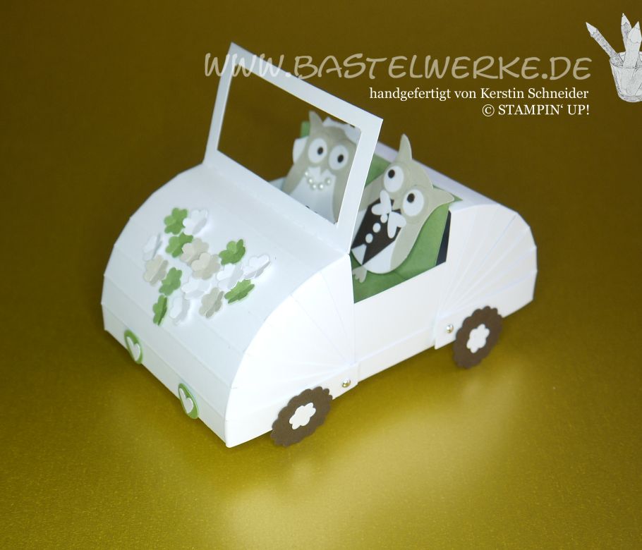 Eine Überraschungsbox zur Hochzeit. Der Kofferraum bietet die Möglichkeit eine Schnur mit Geldscheinen (analog zu den Blechdosen) zu befestigen.