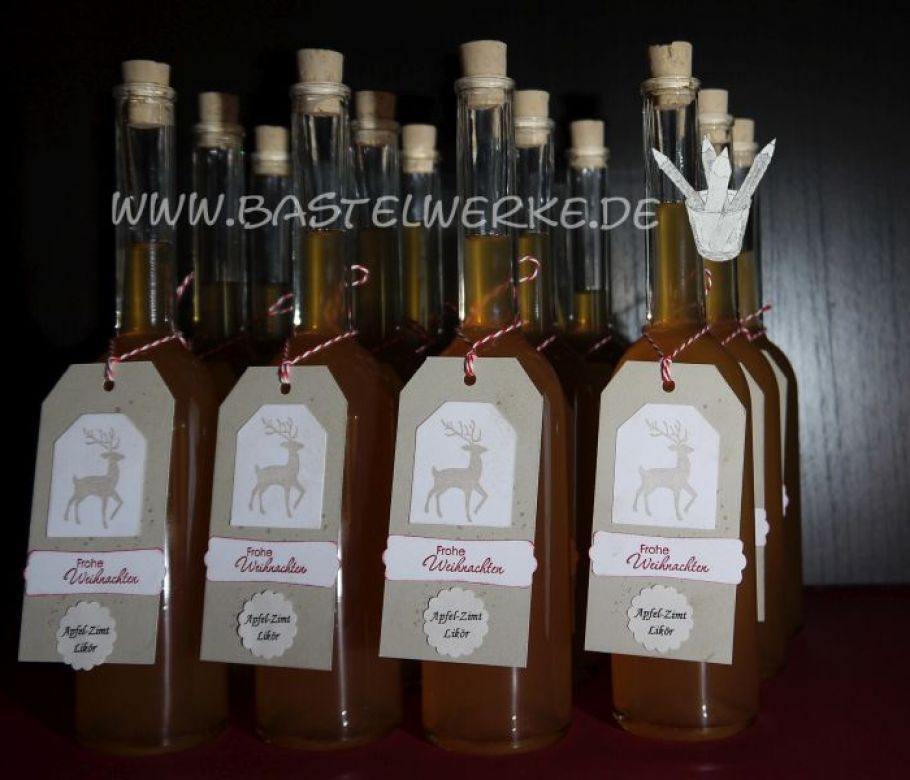 Auftragsarbeit für Liköre: Passende Geschenk-Flaschenanhänger im weihnachtlichen Design.