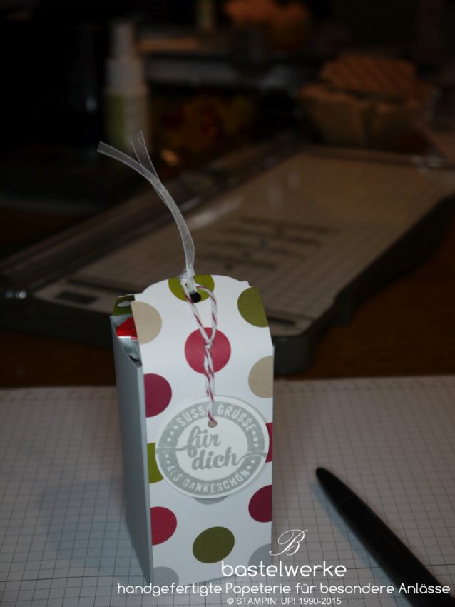 Zu Beginn gab es, wie jedes Mal, ein kleines Gastgeschenk mit Glücks-Kex. Die Teilnehmer waren total begeistert über die Verpackung und ich traf damit voll ins Schwarze, was "Freude schenken" anging. Der Stempel "Ein Geschenk für dich als Dankeschön" aus dem Stempelset Süße Stückchen (Artnr. 140164 / 21,00€) passt sehr gut zu diesem Anlass.