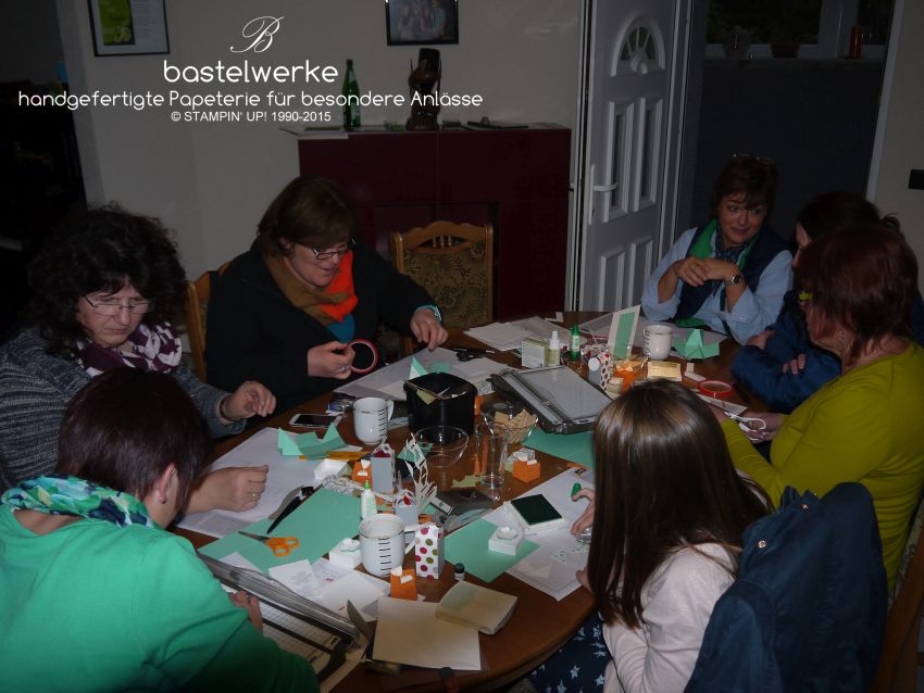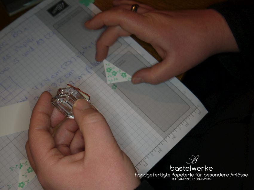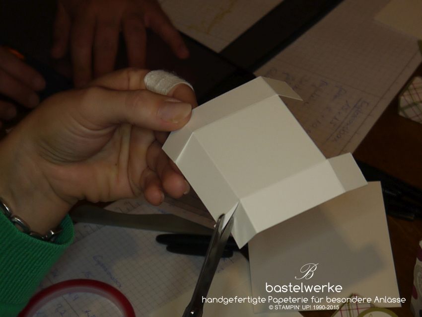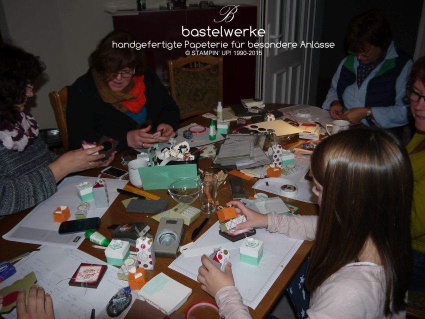 Die Begeisterung der Teilnehmer ist kaum zu beschreiben, als ich die Box vorstellte. Voller Tatendrang wurde gemessen, geschnitten, gestempelt und geklebt. Leider habe ich vor lauter Erklärungen und Hilfestellungen das Fotografieren vernachlässigt. Ein paar Schnappschüsse gibt es jedoch: