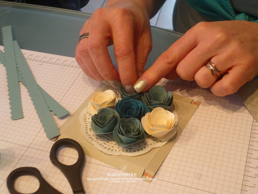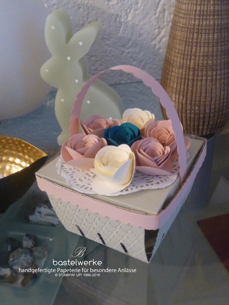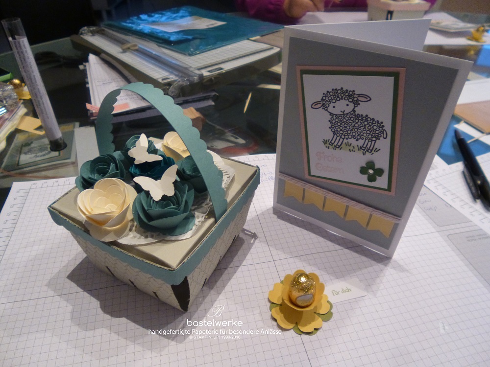 Nach einer kurzen Kaffe- und Kuchenpause kam das aufwendigere Projekt an die Reihe. Undzwar ein Osterkorb mit Deckel.