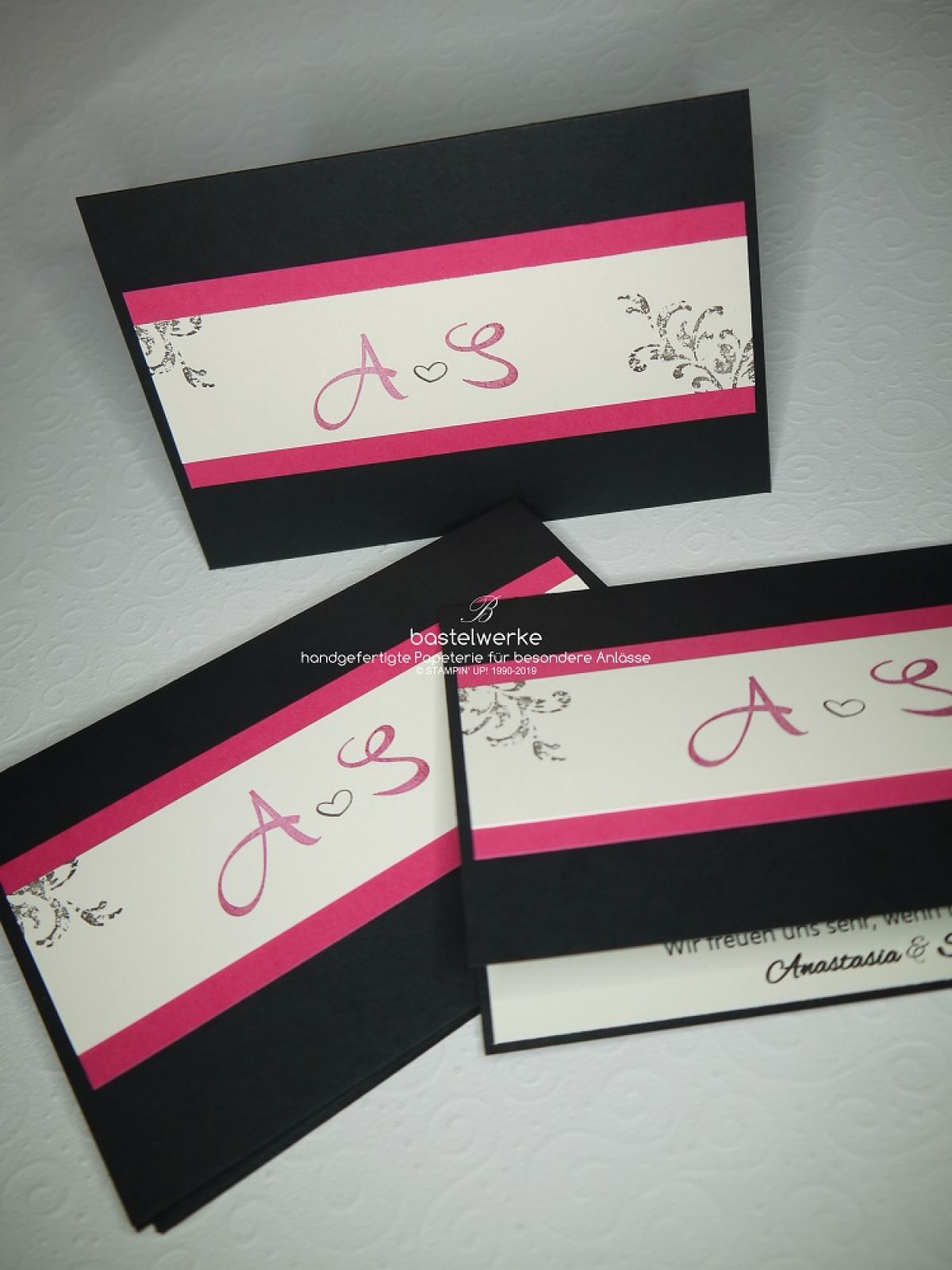 Während einer gemeinsamen Besprechung gestalteten wir diese Karte genau nach deren Wünschen. Und hier ist sie, die Hochzeitseinladung in pink und schwarz. Die Karte sollte sich nach oben aufklappen lassen und im Inneren befinden sich noch zwei Herzen. Eins davon ist pink, das andere nicht schwarz sondern cremefarbend, damit es einen weiteren schönen Kontrast gibt.