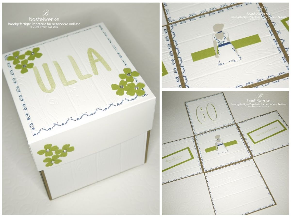 Explosionsbox für Ulla zum 60. Geburtstag. "Ulla lebt in Bayern und liebt Dirndl", das waren die Infos, die ich über das Geburtstagskind bekommen habe. Daher findet sich das Dirndl auch in der Box wieder. Umrahmt wird es von den Sprüchen "Wunderbar mit jedem Jahr" und "Alles Gute zum Geburtstag".