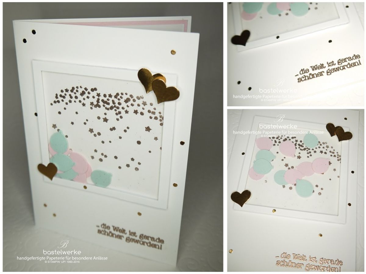 Die Karte für das Mädchen möchte ich euch heute vorstellen. Es ist eine Schüttelkarte, die mit Kupfer-Herzen aufgewertet wurde. Das Innere der Schüttelkarte und der Spruch "die Welt ist gerade schöner geworden" sind in Kupfer embossed und schimmern wunderbar.