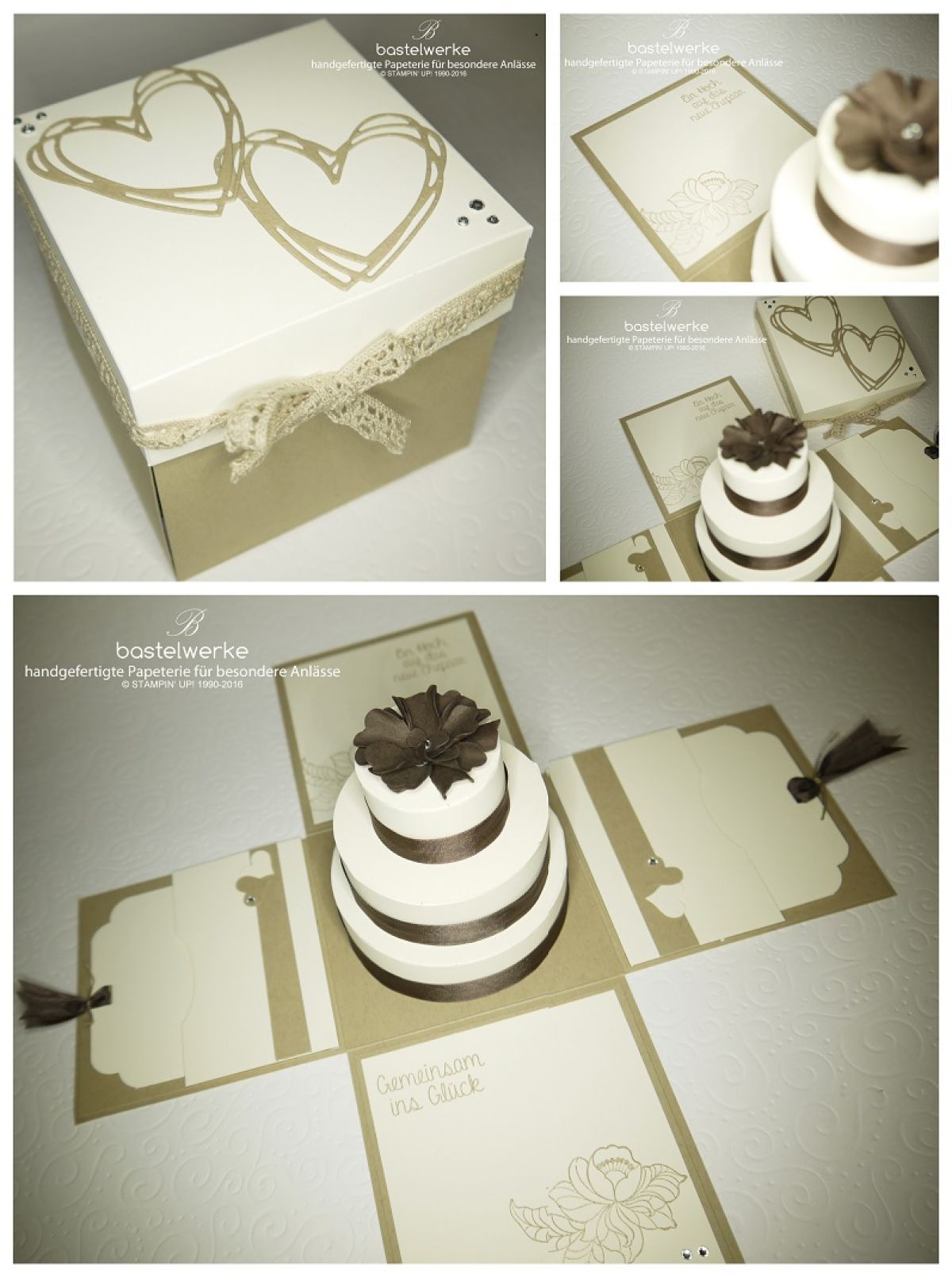 ...wurden mit dieser Box überreicht. Explosionsboxen sind der Renner, wenn es darum geht Geld zur Hochzeit in einer besonderen Form zu verschenken. In diesem Fall kam die Nachbarin meiner Eltern auf mich zu, denn sie war auf der Suche nach einem geeigneten Hochzeitsgeschenk. Neben der Torte, die das Zentrum der Box ausfüllt, gibt es zwei Einsteckfächer. Hier bleibt nicht nur Platz für persönliche Worte, sondern auch ein wenig Stauraum für das Geschenk.