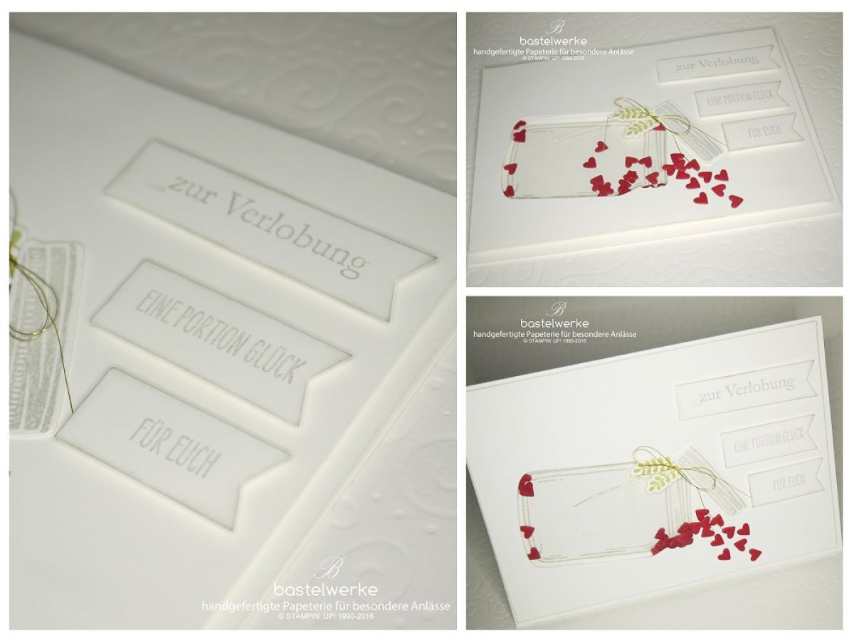 Es handelt sich um eine Schüttelkarte, die dem Paar zur Verlobung eine Portion Glück wünscht. Natürlich durften ein paar Herzchen dem Anlass entsprechend nicht fehlen. Besonders gefreut habe ich mich über ihre Reaktion, als sie schrieb "Wunderschöne individuelle Karten, denen man die Liebe ansieht, mit der sie gemacht wurden!" - Dankeschön!!
