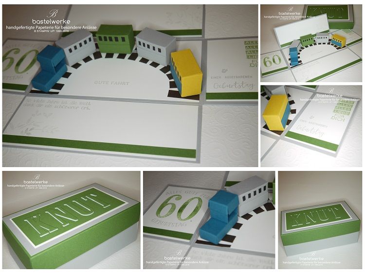 Ganz anderes ist es bei diesem Werk: Gewünscht war eine Box zum 60. Geburtstag für eine Museumszug-Fahrt. Dabei handelt es sich um einen alten Zug der durch die Wetterau von Bad Nauheim zur Burg Münzenberg fährt. Und der Zug ist deshalb so bunt, weil ich mich an den Farben des Originals orientiert habe. Abgerundet wurde das Geschenk mit „abgefahreren Grüßen zum Geburtstag“ und dem schönen Spruch „so viele Jahre ist die Welt dank dir ein schönerer Ort“.