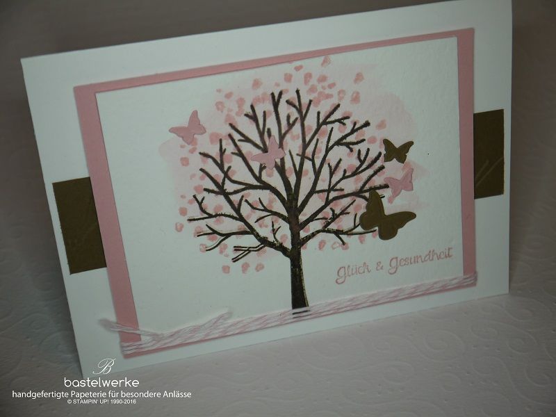 Da die Beschenkte selbst gerne bastelt und ein Herz für Schmetterlinge hat, durften diese natürlich nicht fehlen. Dem Baum habe ich mit Hilfe des Aqua Painters und dem Aquarallpapier ein bisschen Leben eingehaucht, indem ich ihn mit etwas Farbe aus dem Stempelkissen Kirschblüte verziert habe. Und auch die Schmetterlinge sorgen für etwas Lebendigkeit. Neben den kleinen Schmetterlingen am Baum, die aus dem nicht mehr erhätlichen Embosslit Schmetterlingsgarten stammen, finden sich auch im Hintergrund weitere Schmetterlinge. Wer ganz genau hinschaut entdeckt sie auf dem Espresso-Streifen im Hintergrund.