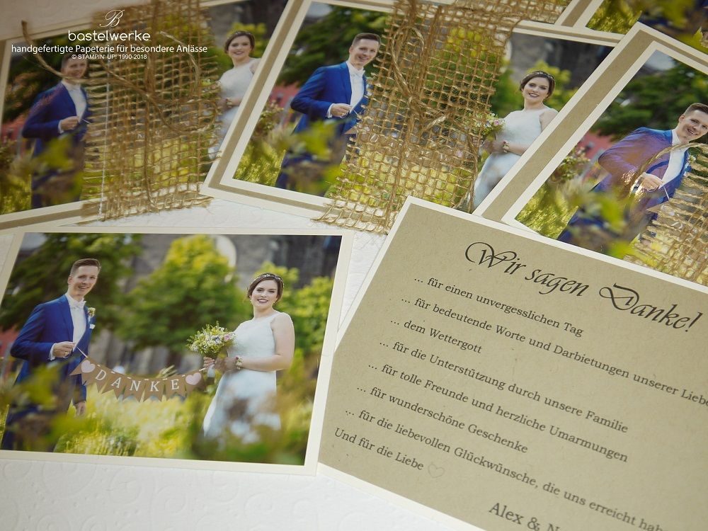 Für die Danksagung hat sich das Brautpaar ein Postkarten-Format gewünscht. Das Bild ist fixiert und die Jute-Banderole ist abnehmbar.