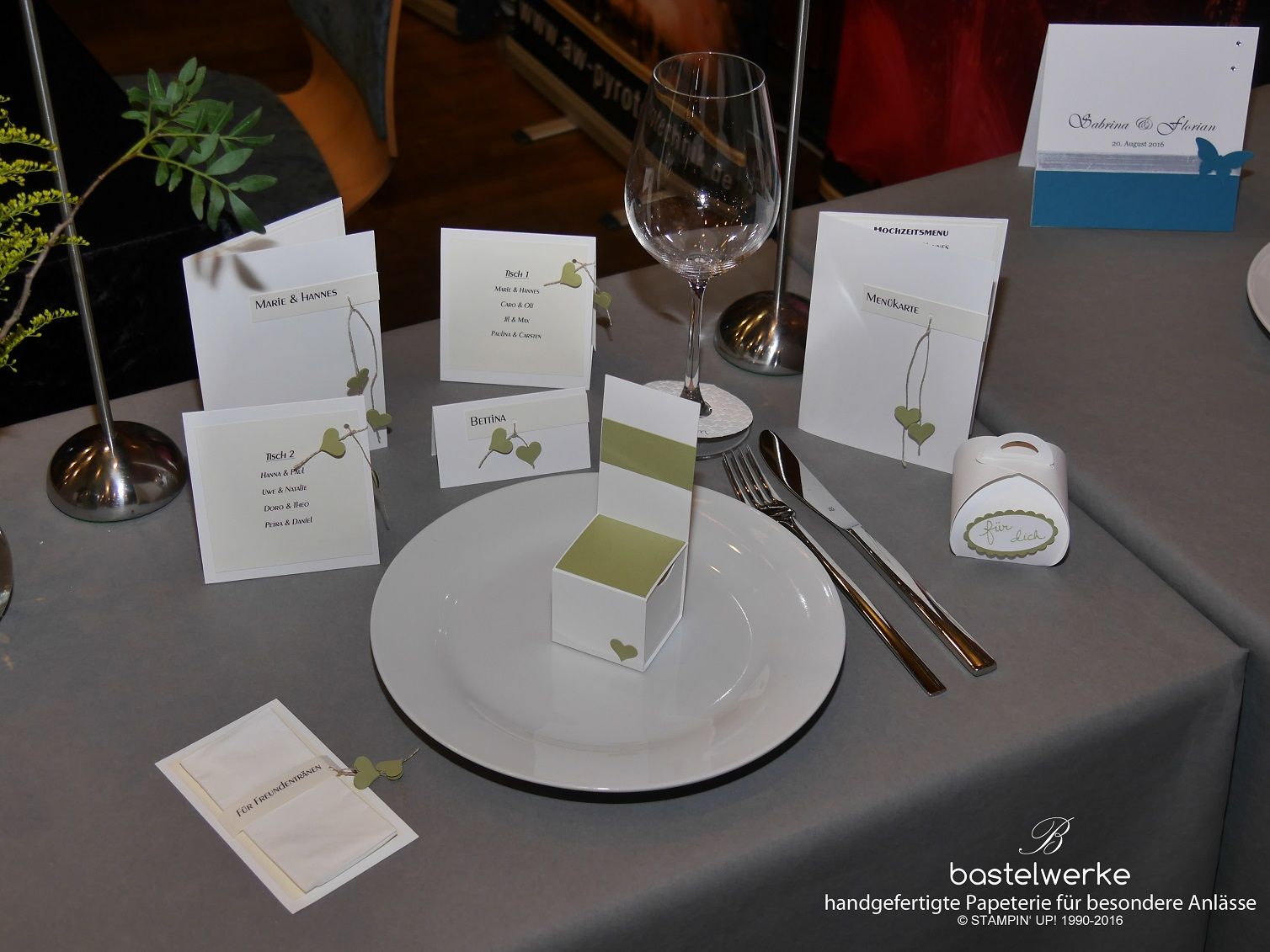Die Menükarten (links) wurden im beliebten Dreiecksformat gestaltet und die Gewürz-Gastgeschenke fanden in dieser schönen Box einen passenden Platz (siehe Teller). Außerdem erhielt jeder Gast ein persönliches Platzkärtchen mit seinem Namen.