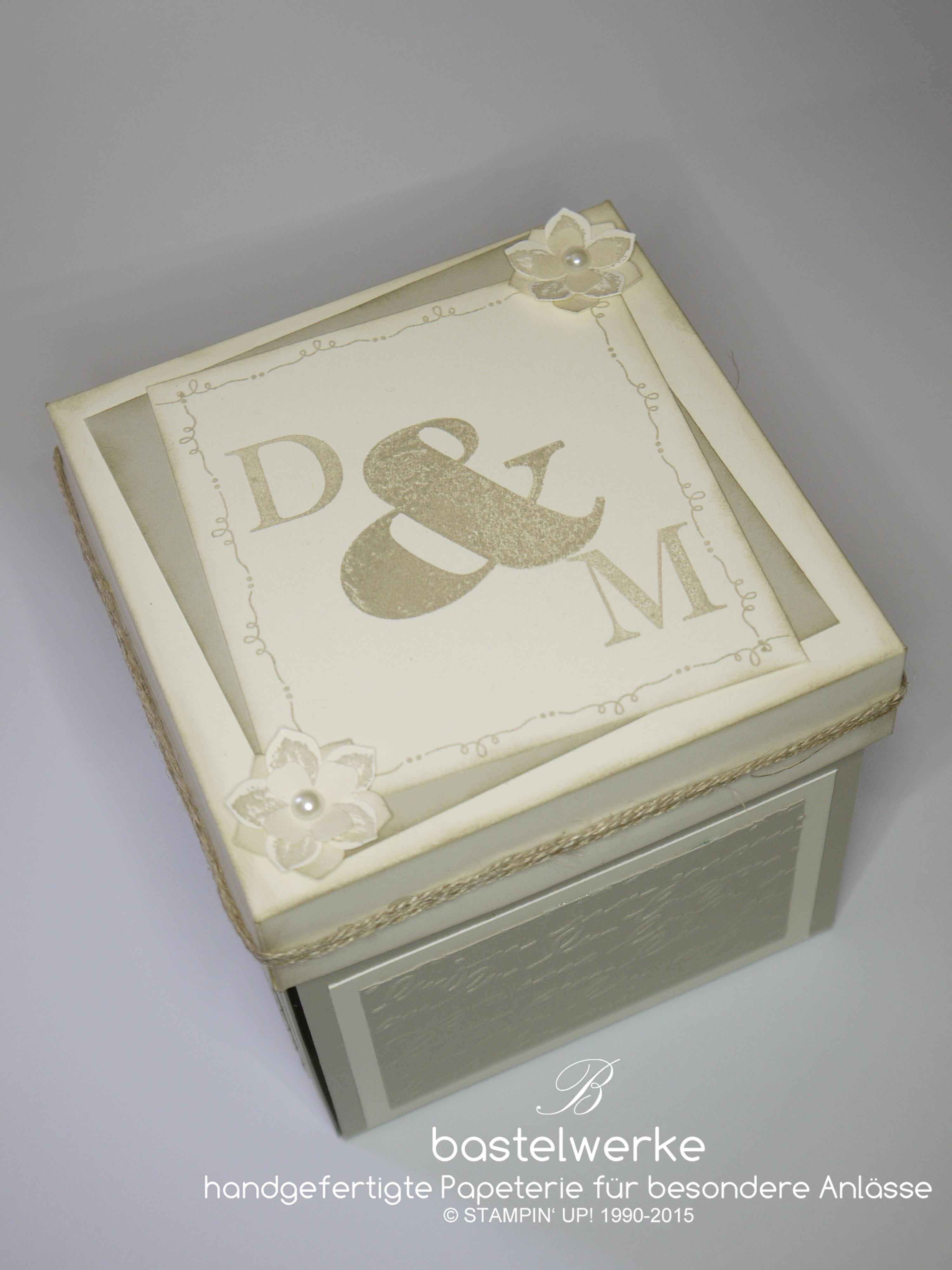 ...wurden mit dieser Box überreicht. Explosionsboxen sind der Renner, wenn es darum geht Geld zur Hochzeit in einer besonderen Form zu verschenken. In diesem Fall kam die Nachbarin meiner Eltern auf mich zu, denn sie war auf der Suche nach einem geeigneten Hochzeitsgeschenk. Neben der Torte, die das Zentrum der Box ausfüllt, gibt es zwei Einsteckfächer. Hier bleibt nicht nur Platz für persönliche Worte, sondern auch ein wenig Stauraum für das Geschenk.
