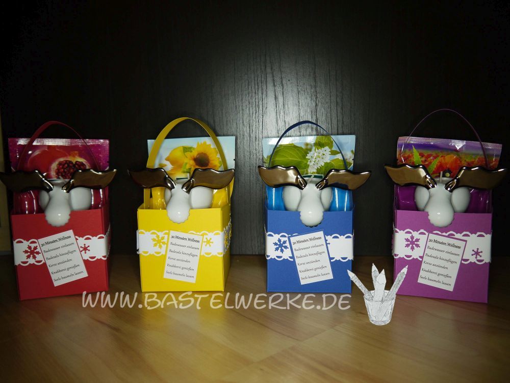 Der Wunsch der hier umgesetzt wurde, war eine Verpackung für je einen Teelichthalter und einen Badezusatz.