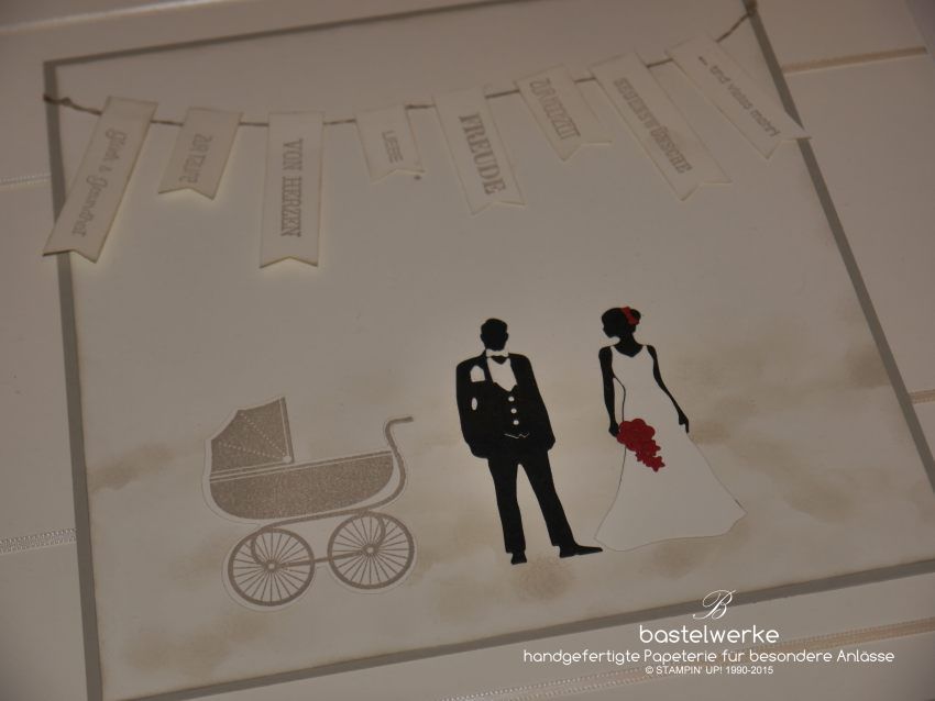 Auftragsarbeit für eine Hochzeit mit Taufe. Diesmal handelt es sich um keine Karte, sondern um einen themenbezogenen 3D-Bilderrahmen. Das Passepartout bleibt der Auftraggeberin zur freien Gestaltung und wir mit einem Bild der jungen Familie, Herzen und einem finanziellen Bonbon ergänzt.