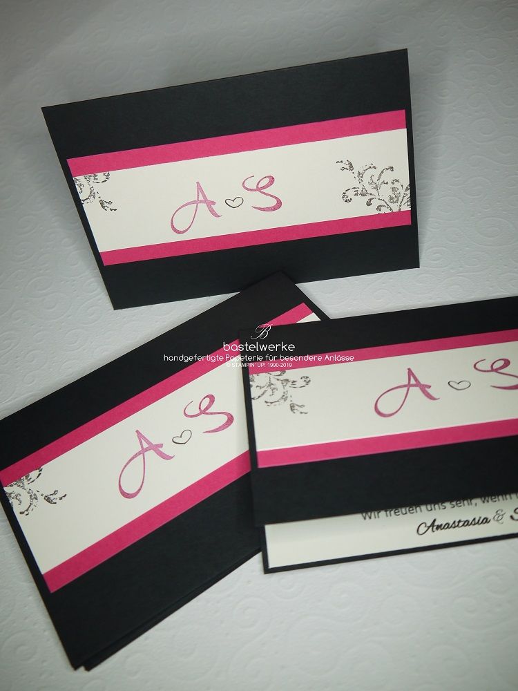 Kompromisse sind Gemeinsamkeiten wahrer Liebe. Und den ersten Kompromiss sind die beiden bereits bei der Einladung eingegangen. Wenn die Braut sich für die Farbe pink entscheidet, dann darf der Bräutigam schwarz dazu kombinieren. Fair, oder?