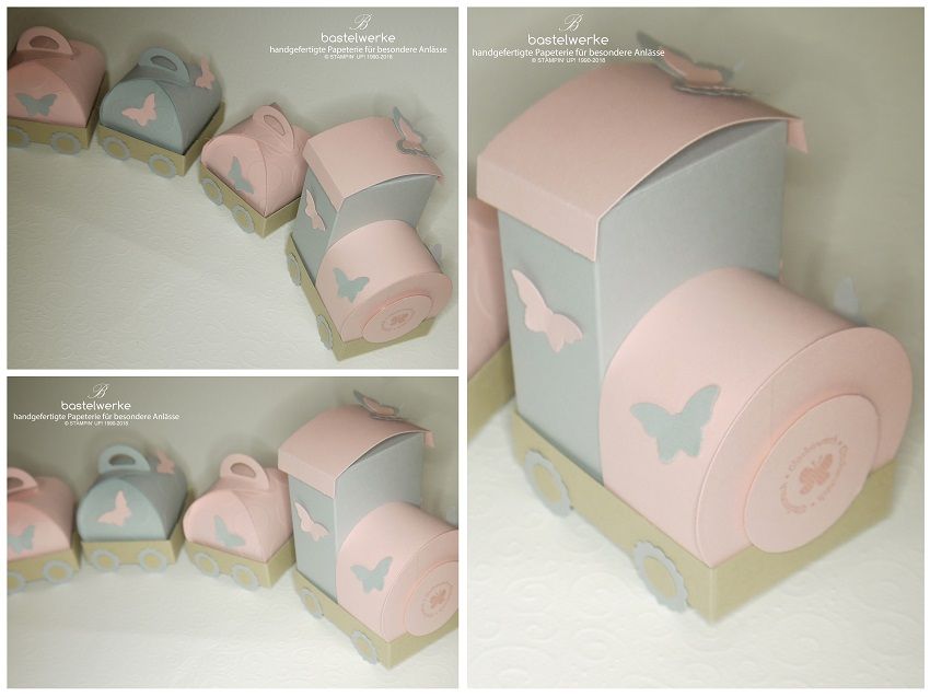 Eine Auftragsarbeit in den Wunschfarben Rosa und Grau. Der Wunsch kam auf, dass die Waggons mit vielen Schmetterlingen dekoriert werden. In die vier Waggons lassen sich kleine Geschenke verstecken.