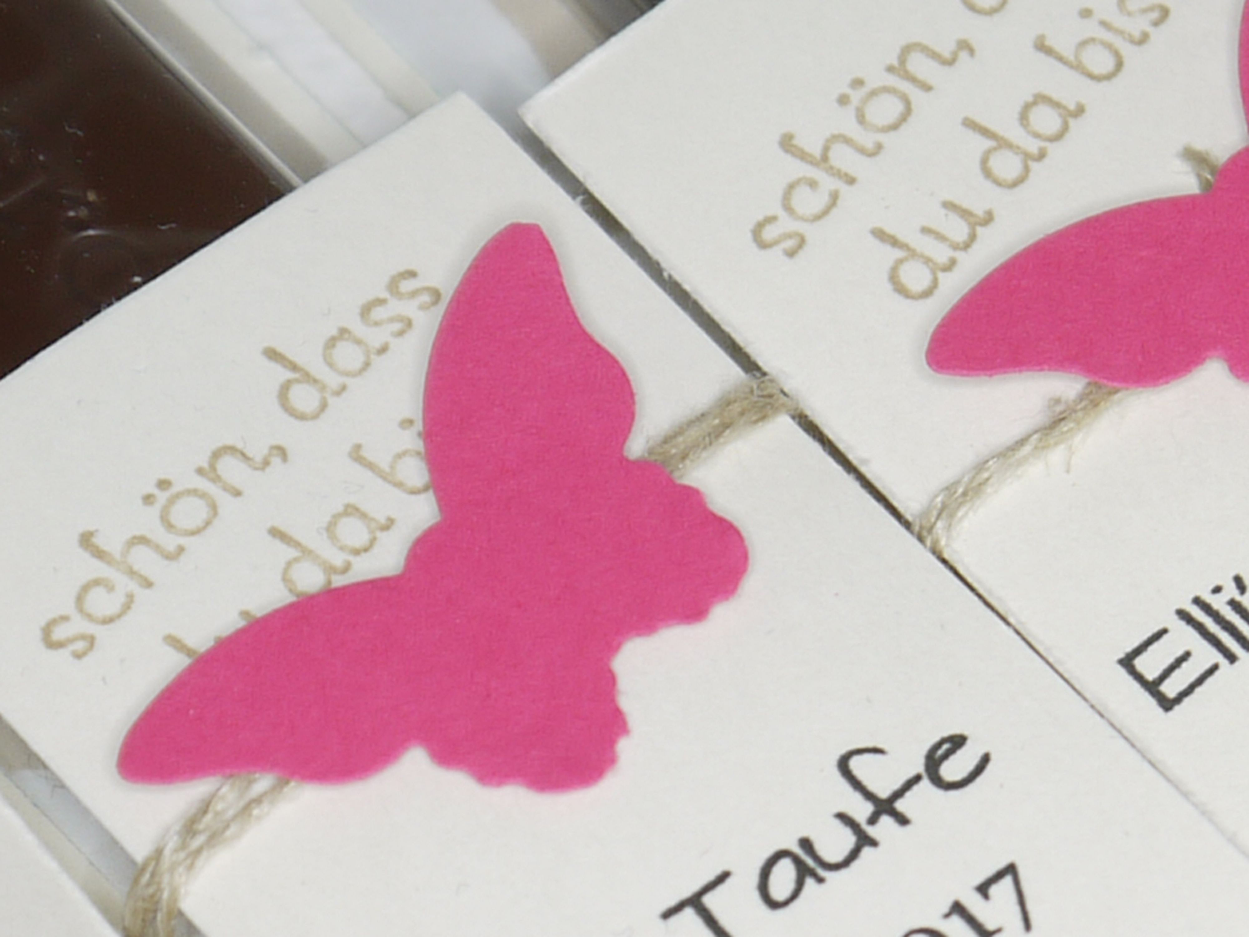 Mit dem Spruch "Schön, dass du da bist!" wurde heute jeder Gast bei der Taufe der kleinen Elli begrüßt. Insgesamt entstanden in diesem Rahmen 40 dieser Riegel, die sich farblich an die Tischdeko angelehnt haben. Wie sollte es auch anders sein, die Frage nach den Farben ist eine der ersten Fragen die ich stelle, wenn Kunden mit mir Kontakt aufnehmen.