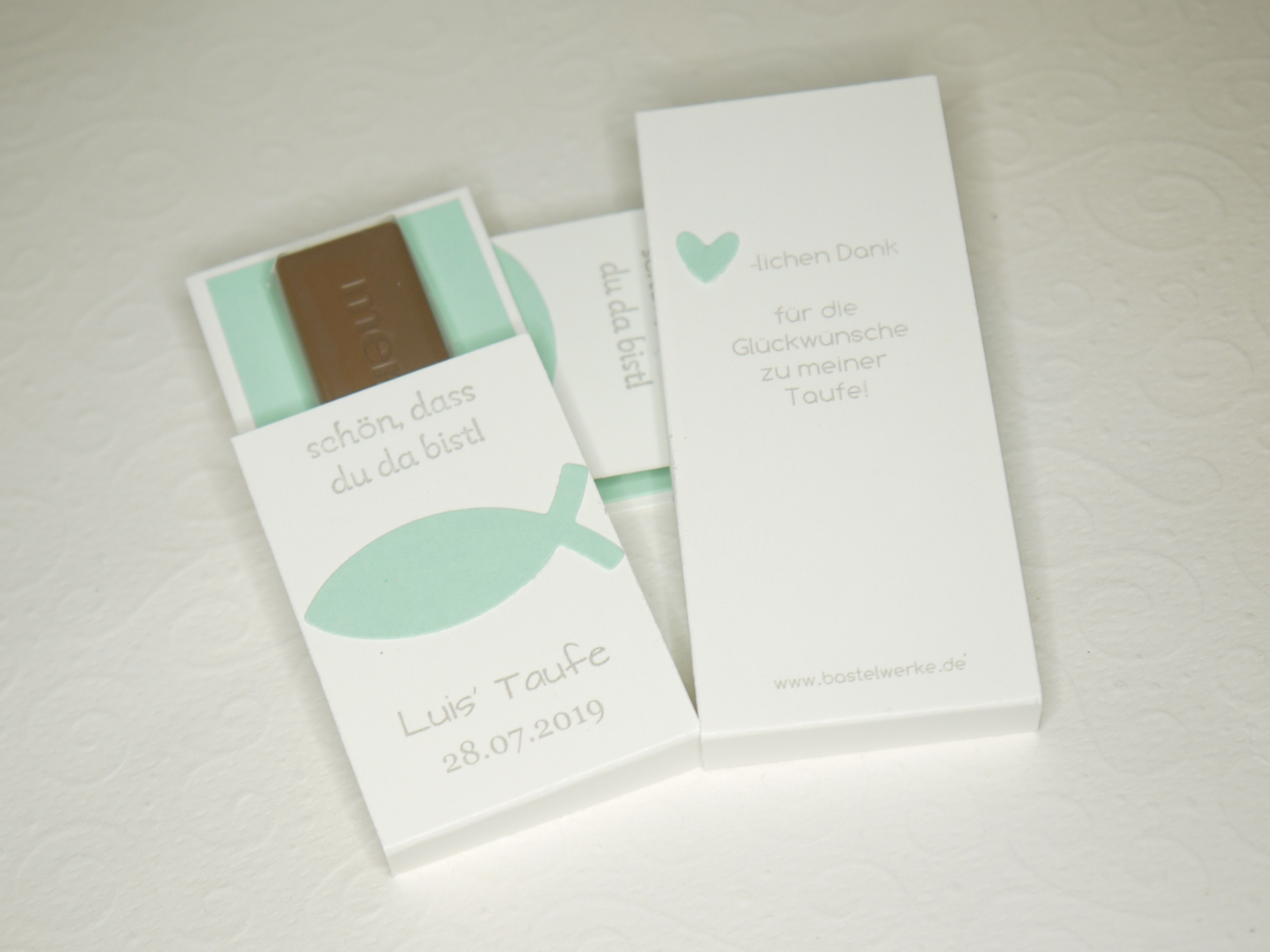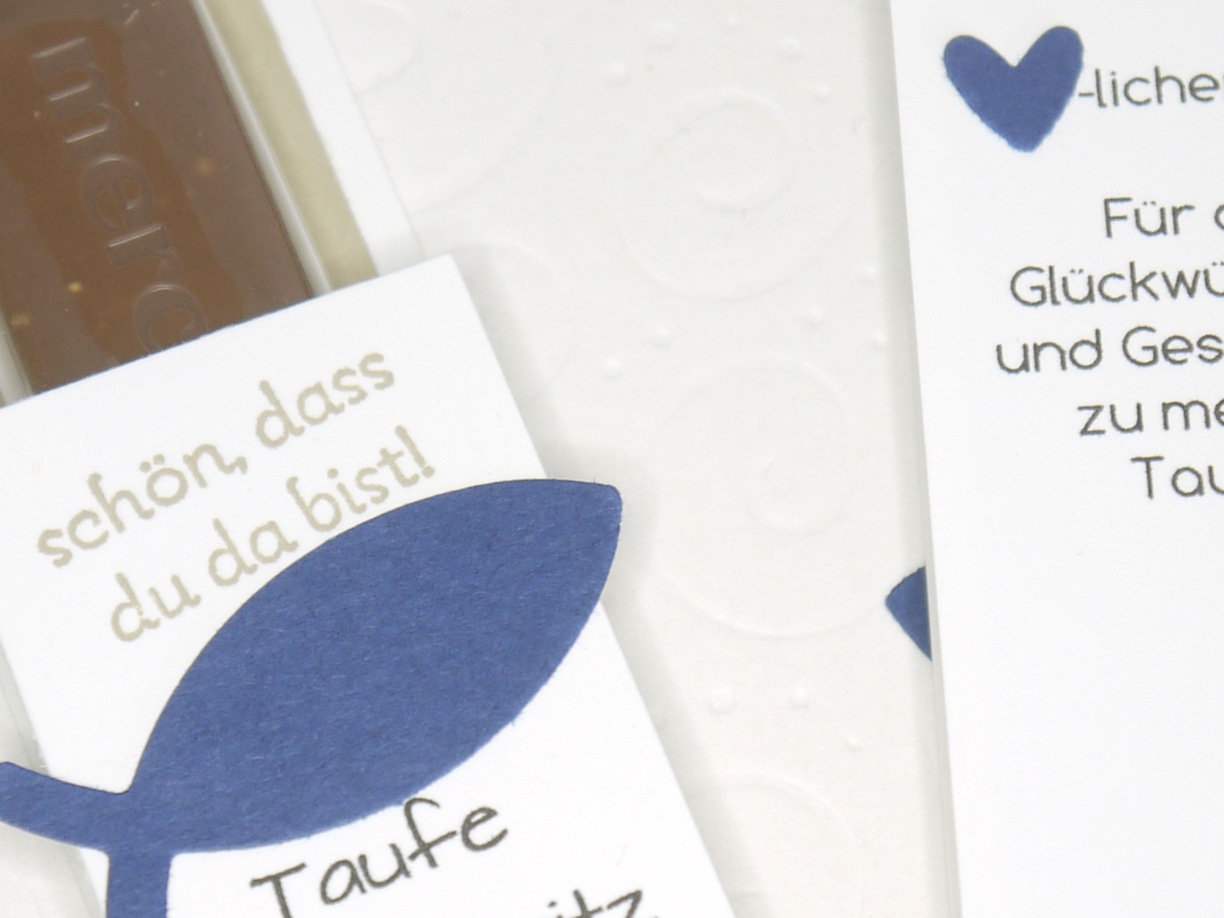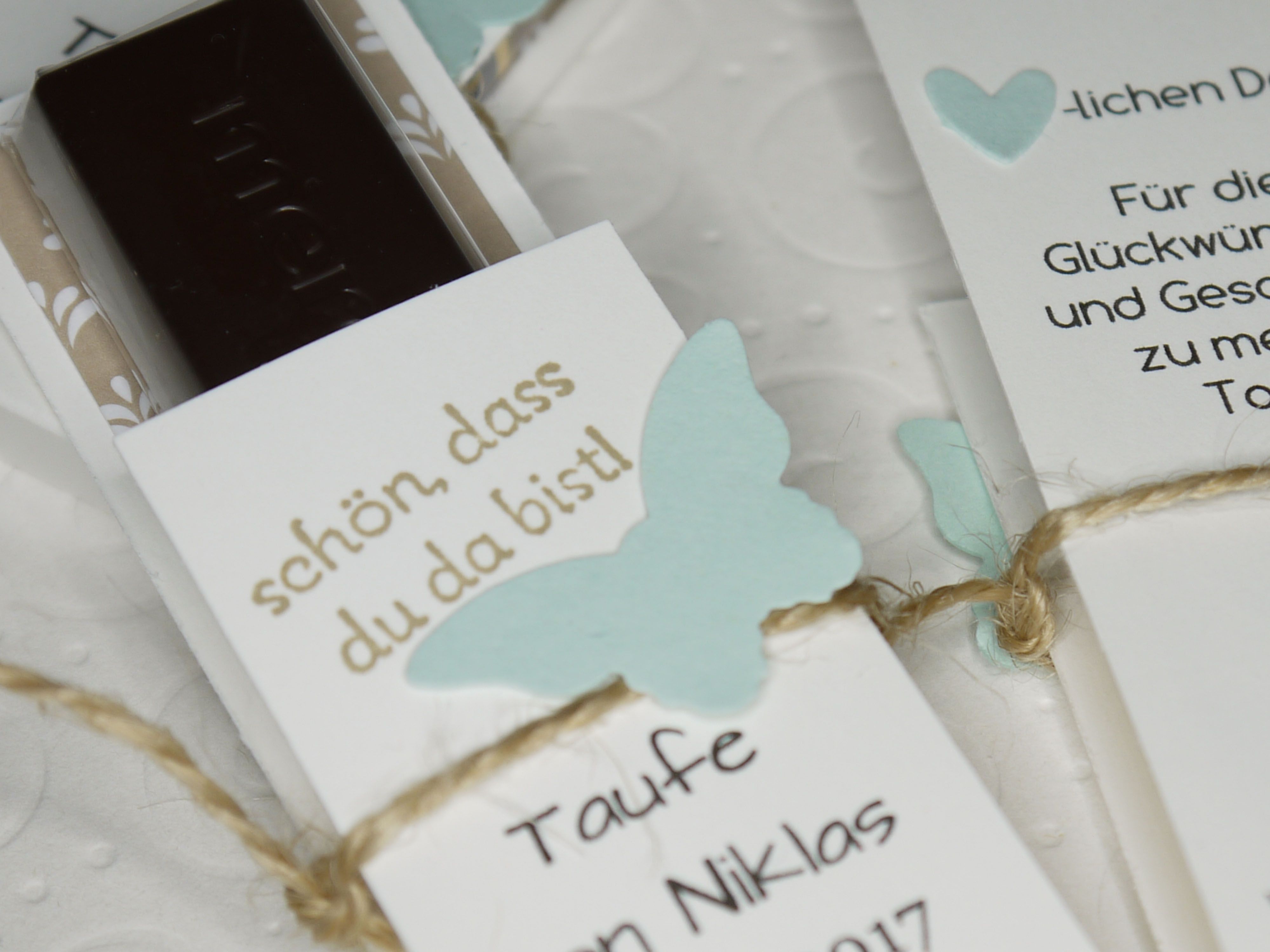 Hier seht ihr die Gastgeschenke zur Taufe von Niklas in den Wunschfarben Babyblau und Braun. Die Riegel habe ich euch hier schon für eine Mädchen-Taufe gezeigt. Im Juni fand die Taufe von Niklas statt und seinen Eltern haben die Riegel gut gefallen. Daher wollten sie ihren Gästen die Ankunft gerne mit einem Schokoriegel versüßen. Ich sage Merci für euer Vertrauen.